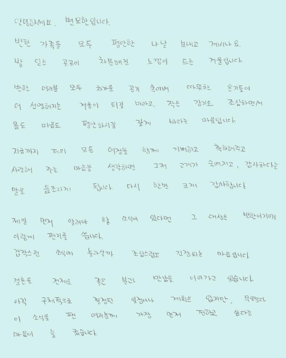 열애설이 보도되기 전, 두 사람은 각자의 인스타그램을 통해 팬들에게 직접 손편지를 남겨 진심을 전했습니다.