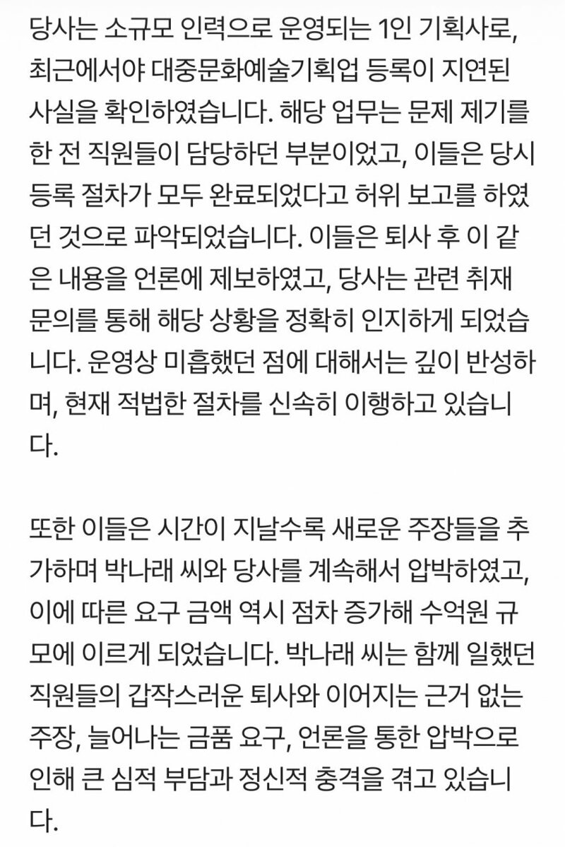 또 하나의 문제는 박나래 씨의 소속사가 '대중문화예술기획업'으로 등록되지 않은 상태였다는 점입니다.